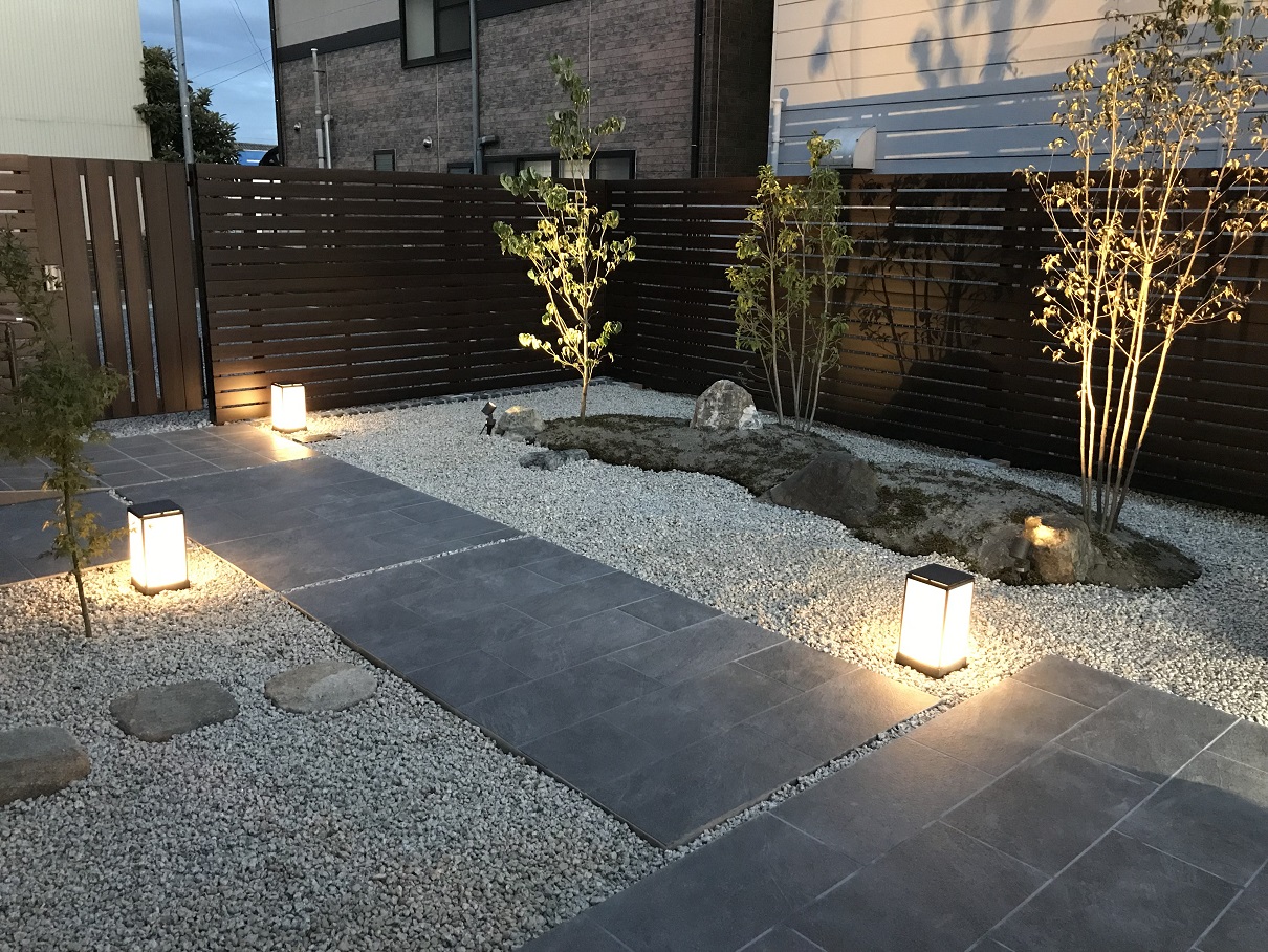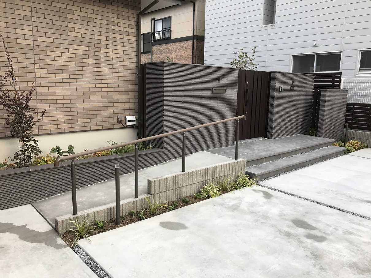 ブロック積み造成工事から外構工事まで施工させて頂きありがとうございました。ヨドガレージもダークブラウンに塗装して拘り、全体をダーク系色にまとめて重厚で落ち着きのあるスタイルに仕上がりました。