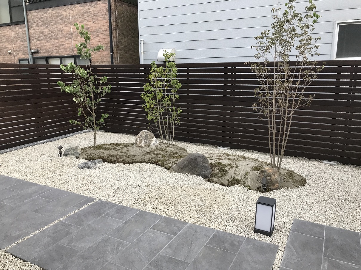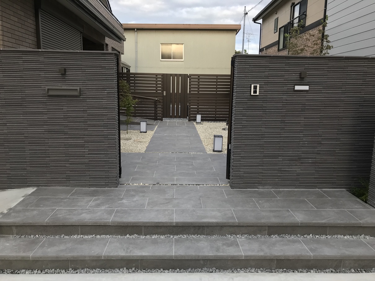 ブロック積み造成工事から外構工事まで施工させて頂きありがとうございました。ヨドガレージもダークブラウンに塗装して拘り、全体をダーク系色にまとめて重厚で落ち着きのあるスタイルに仕上がりました。