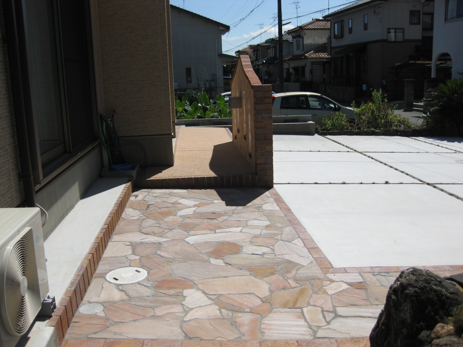 新築外溝工事を施工させて頂きました。元々は本家の庭だった場所に建てられたので、和風の本家との境をどう仕上げるか問題でしたが、打合せを繰返して決定した結果、バランス良く自然な仕上がりとなりました。