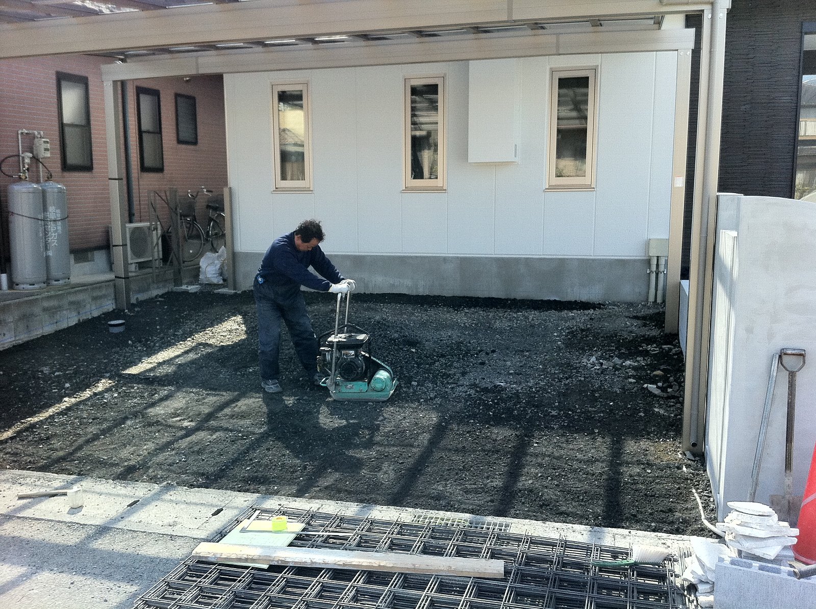 カーポートが完成したら、土間コンクリートの下準備で整地転圧しメッシュ筋を敷きます。
