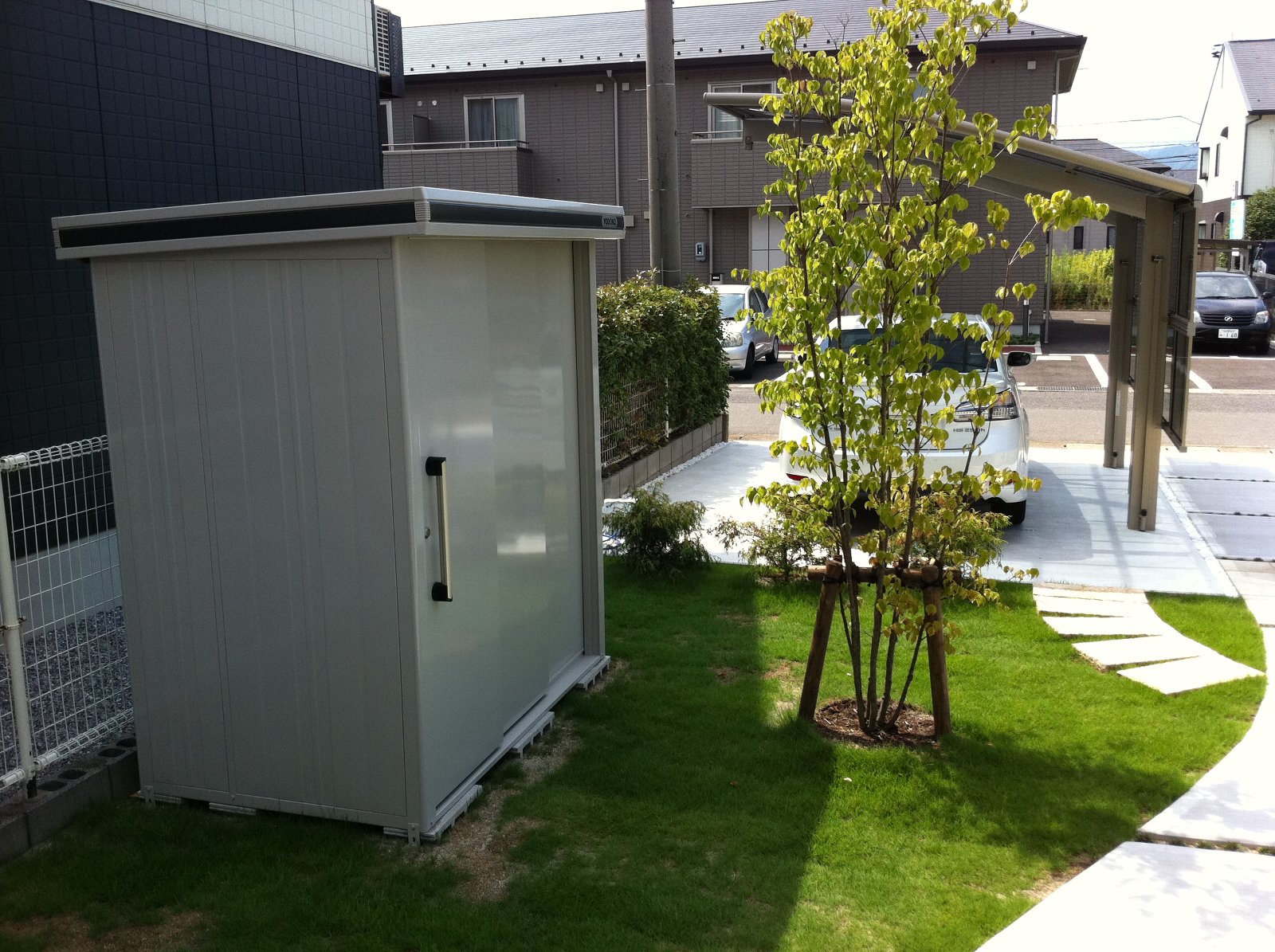 物置がアプローチ少し隠れるように、株立のヤマボウシを配置