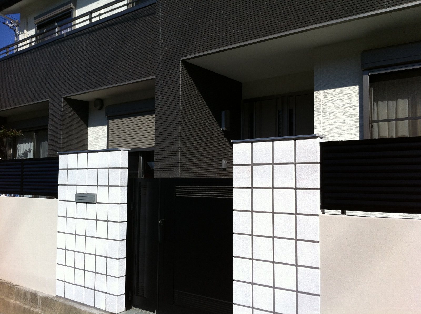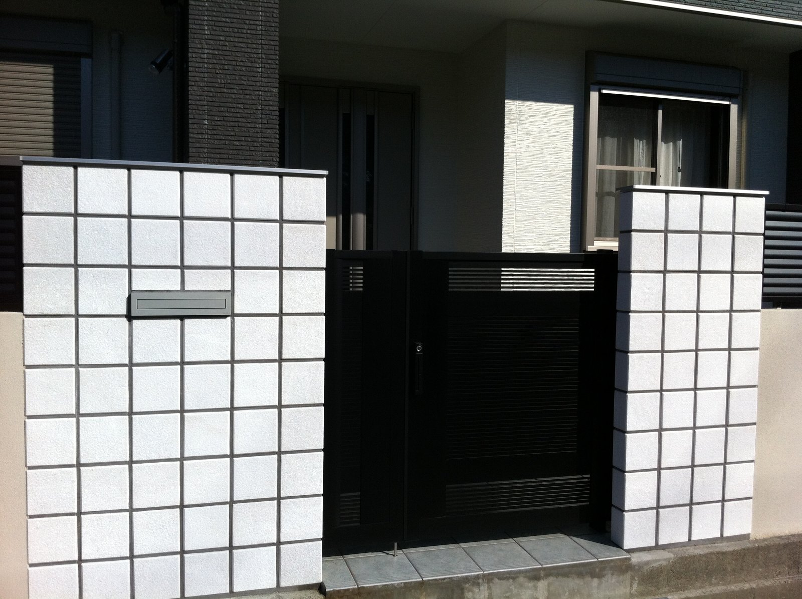 出来るだけ予算を抑える為に既設のブロック塀を塗装してリフレッシュし、その上に目隠しフェンスを設置しました。ポイントとなる門柱には高級感のある天然石ブロックを使用して仕上げました。