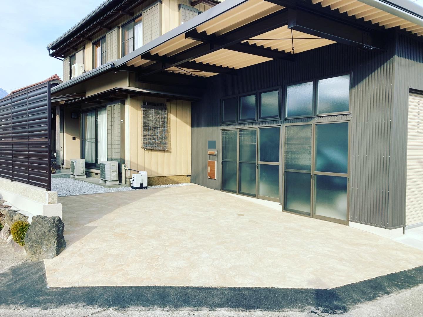 揖斐川町 F様邸 外構工事 カーポート 人工芝 洗い出し土間コンクリート 目隠しフェンス 宅配ポスト
