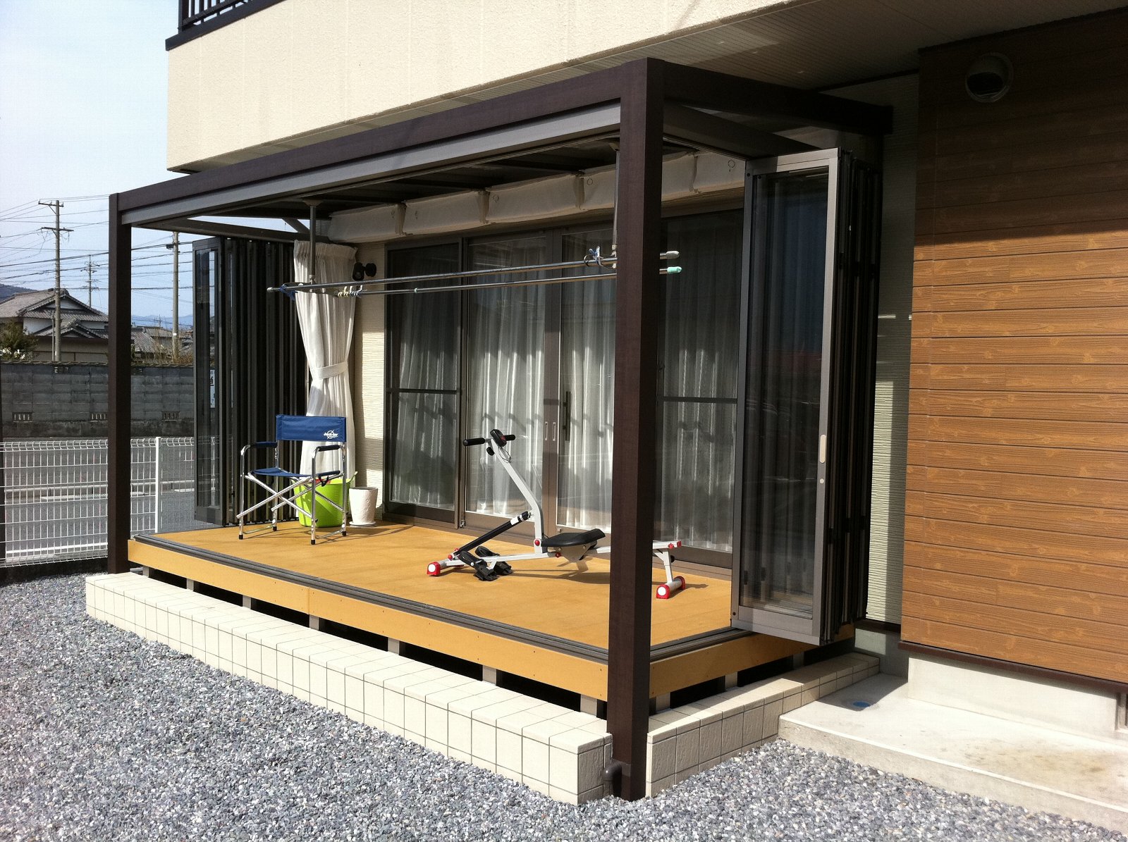 折戸パネルが自由に開き動く所が、とても便利で気に入っています。天気の良い日はフルオープンにして日光浴をしながら読書やエクササイズを気持良く楽しめます。また、雨が降りそうな日でも折戸パネルをクローズにしておけば、洗濯をしていても安心して出かけられます。