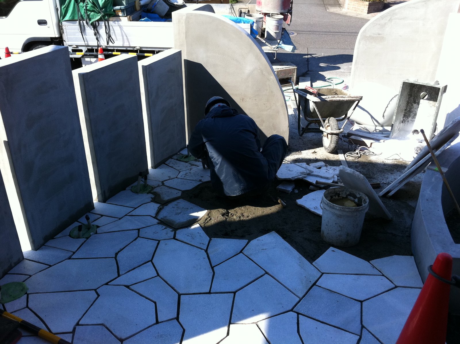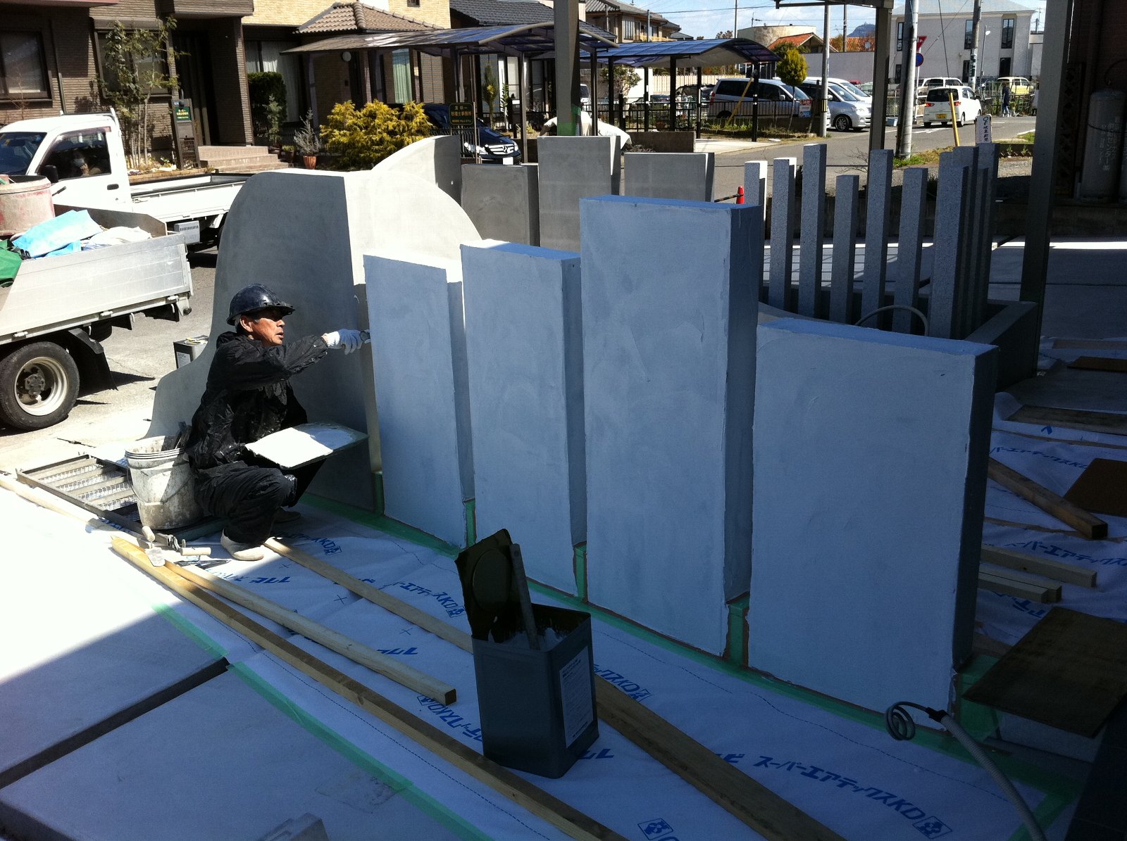 次は石貼り工事です、バラバラで大きさの異なる天然石を削りながら張り合わせていきます。職人さんの腕の見せ所ですね。