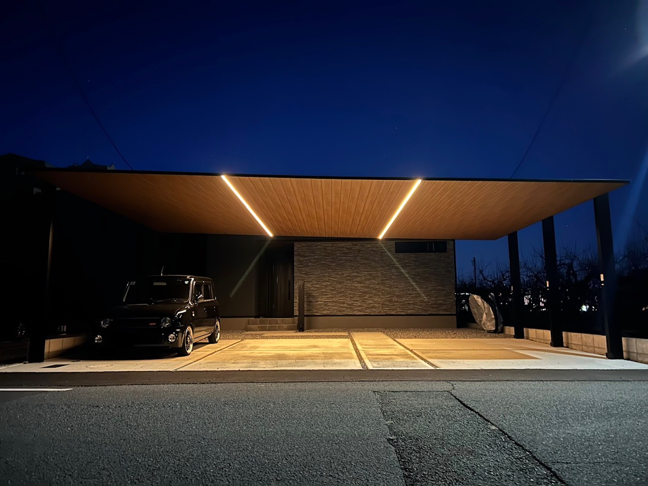 瑞穂市 M様邸 外構工事 カーポートSC3台用 木目屋根 LED照明