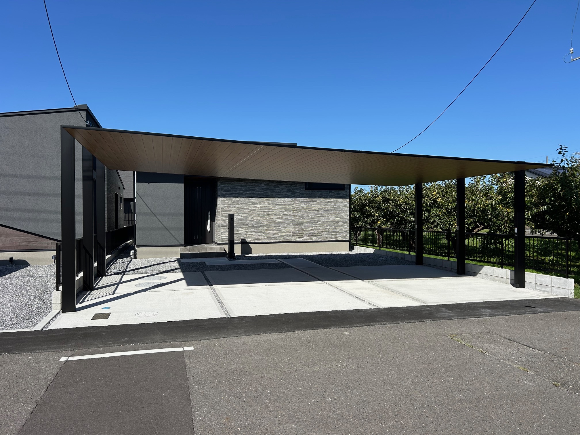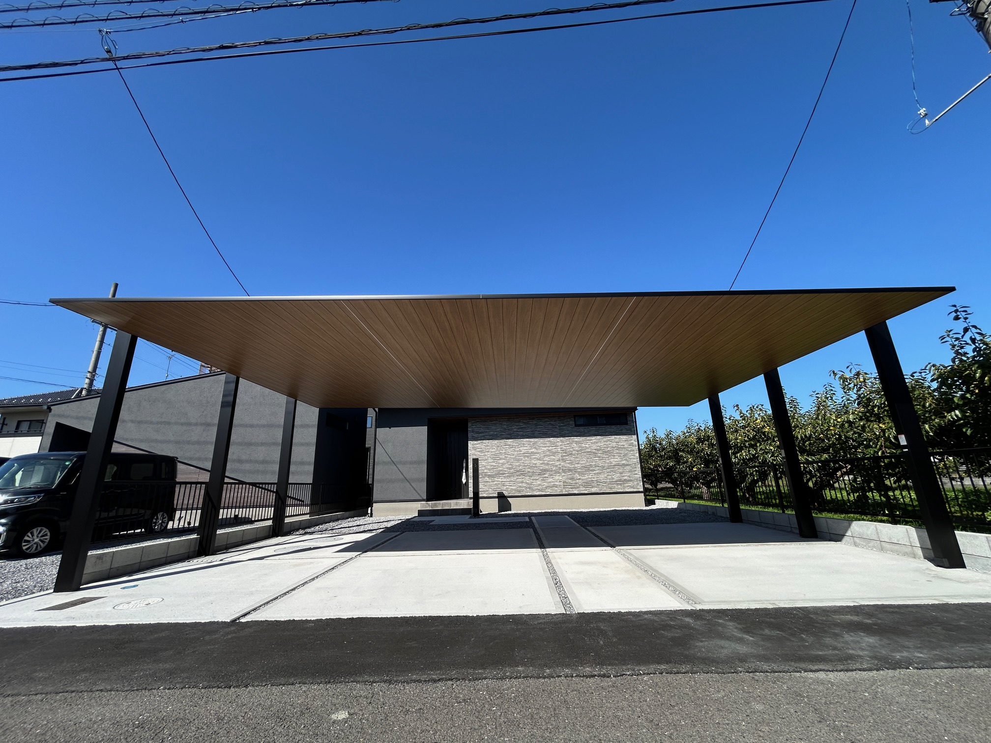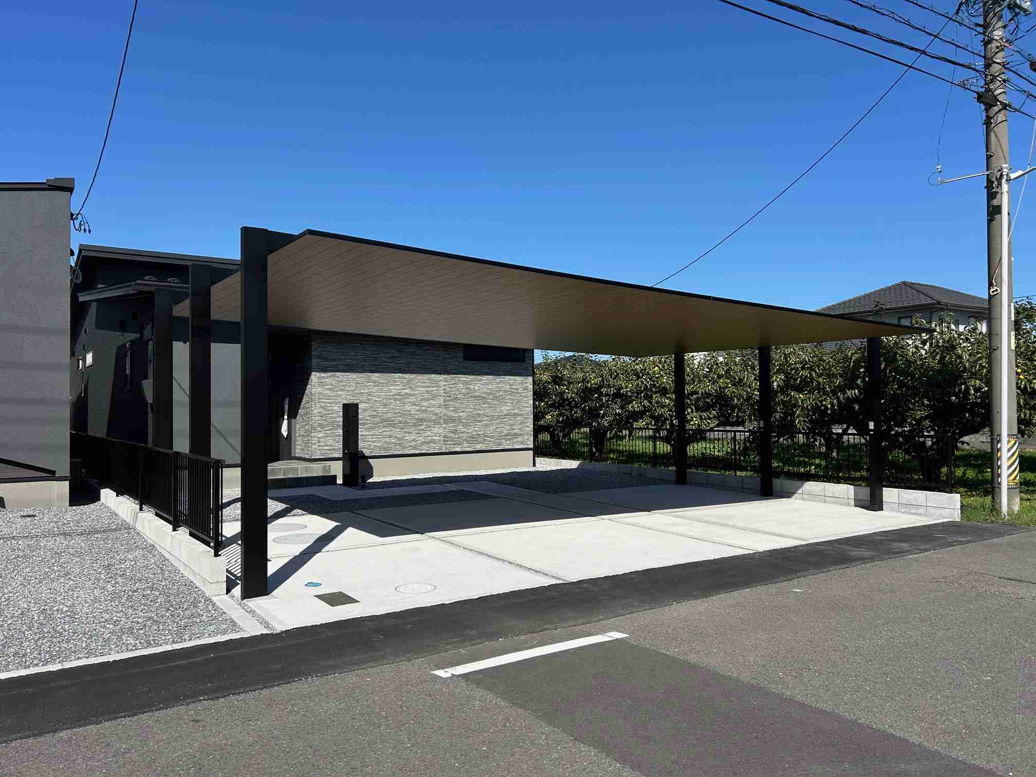 ホーム>施工例> 瑞穂市 M様邸 外構工事 カーポートSC3台用 木目屋根 LED照明