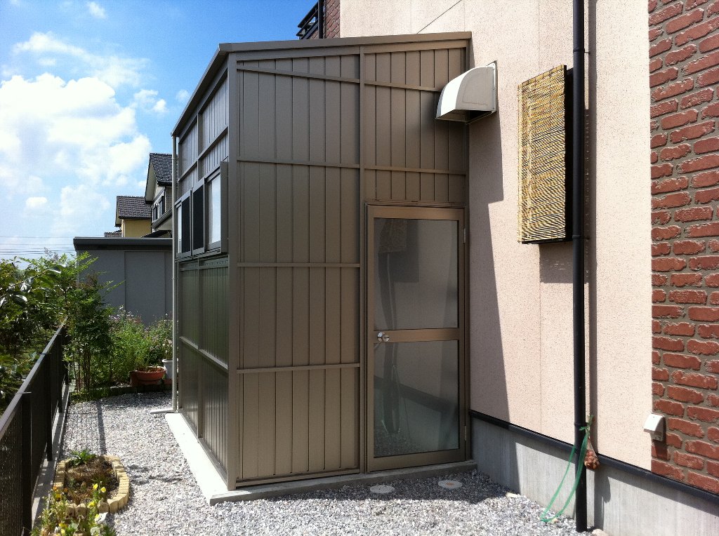 今回のお客様は、見た目が良く中が明るくなるような物置をお探しでしたので、三協立山アルミのオイトックをお勧めしました。オイトックは収納ルームや洗濯干し部屋として使え、屋根が透明なポリカーボネイド製の為、中が明るいのが特徴です。側面パネルはアルミ製で外からの視線をカットしています。