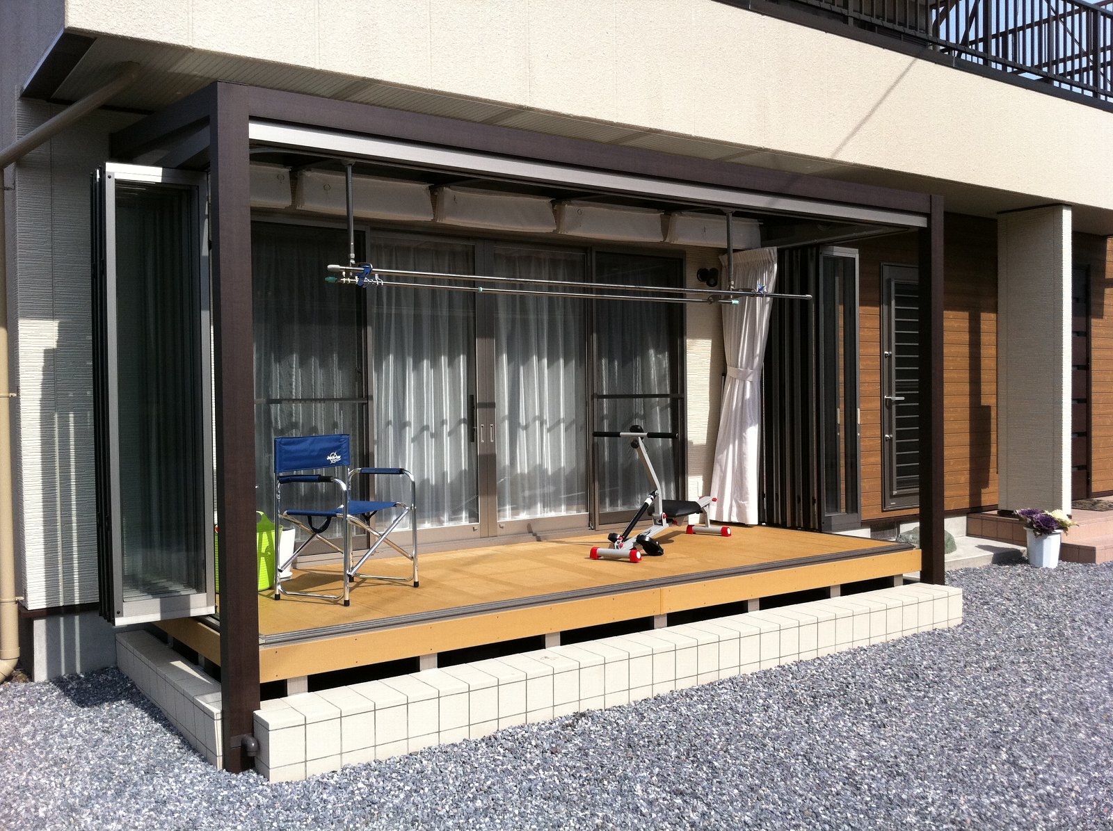 折戸パネルが自由に開き動く所が、とても便利で気に入っています。天気の良い日はフルオープンにして日光浴をしながら読書やエクササイズを気持良く楽しめます。また、雨が降りそうな日でも折戸パネルをクローズにしておけば、洗濯をしていても安心して出かけられます。