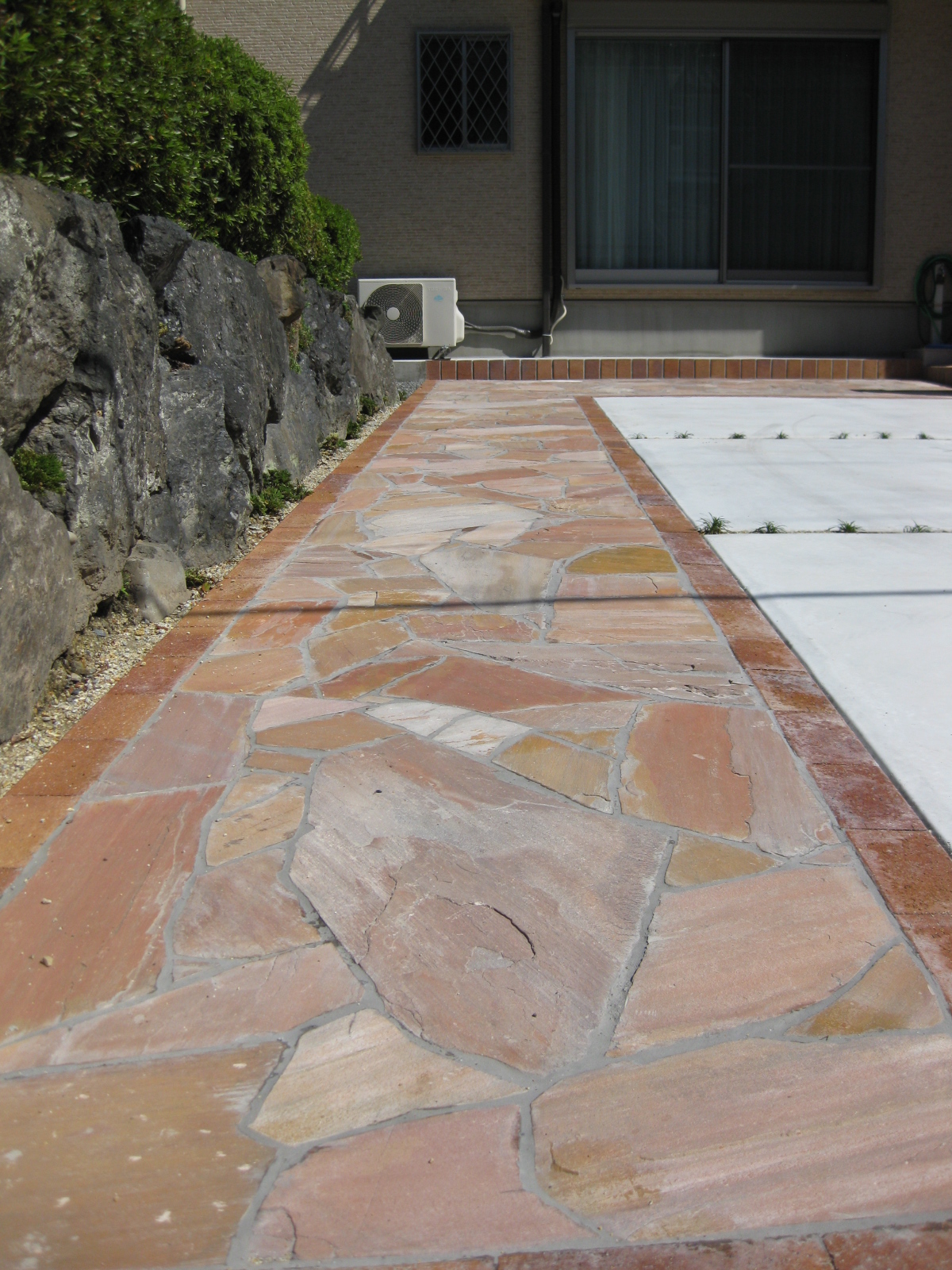 新築外溝工事を施工させて頂きました。元々は本家の庭だった場所に建てられたので、和風の本家との境をどう仕上げるか問題でしたが、打合せを繰返して決定した結果、バランス良く自然な仕上がりとなりました。