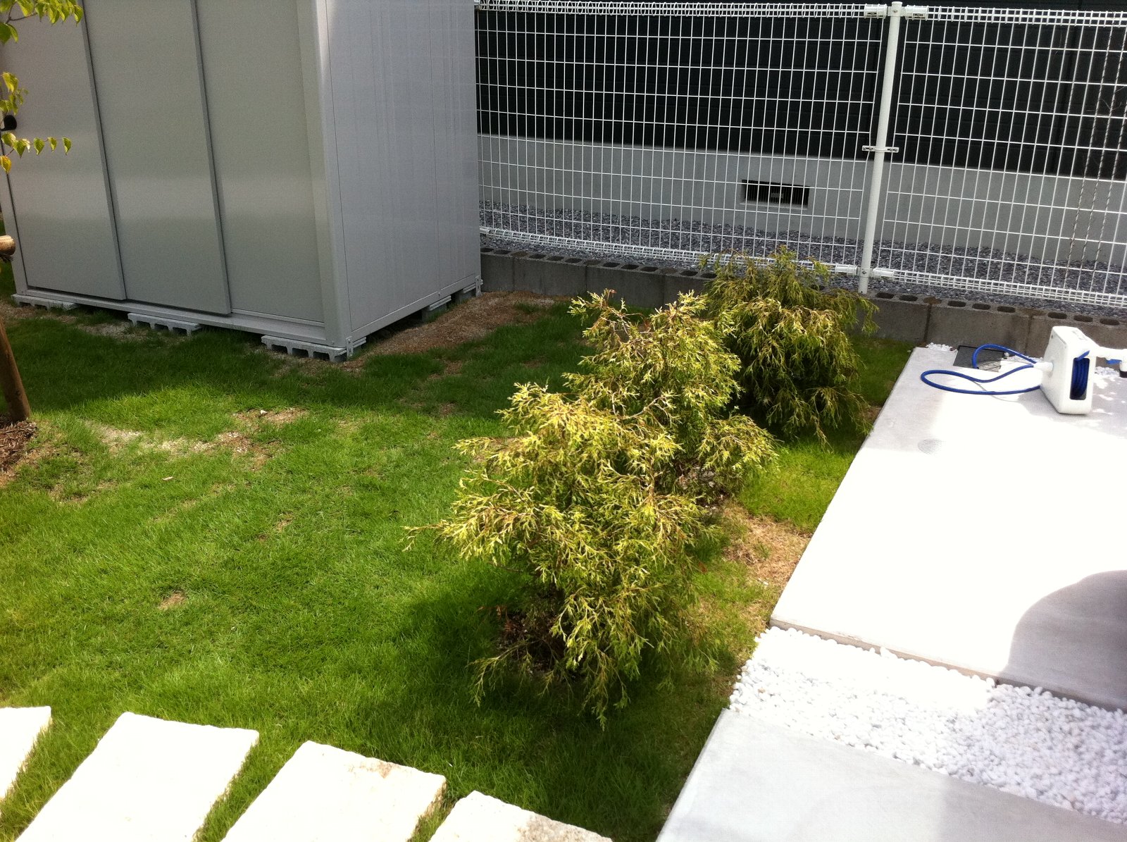 物置がアプローチ少し隠れるように、株立のヤマボウシを配置