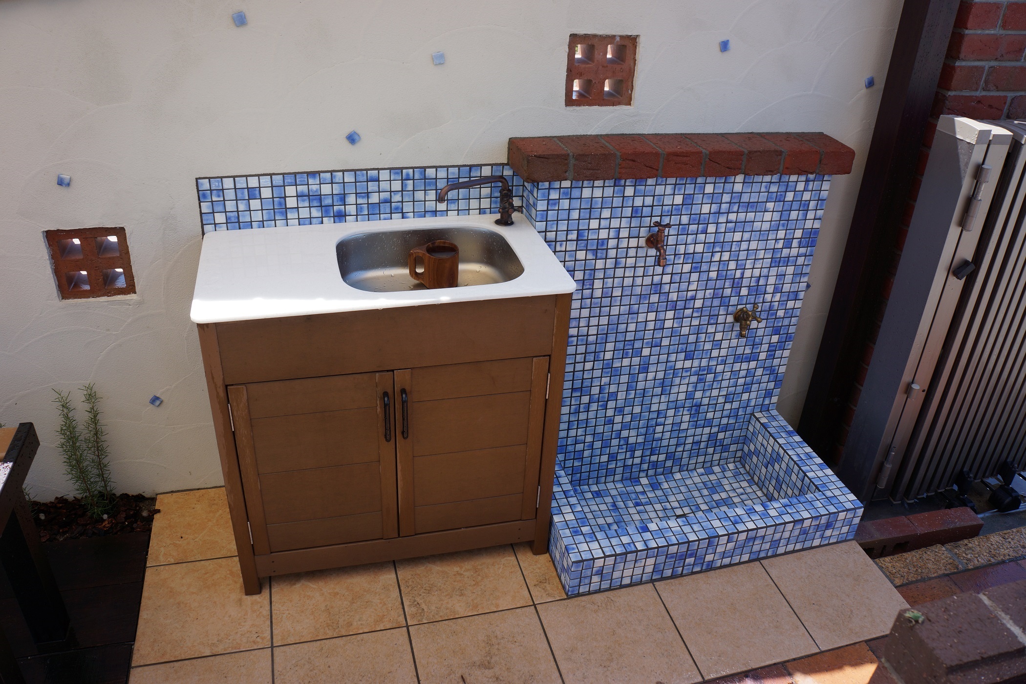 手前側がオリジナルのモザイクタイル貼り立水栓
