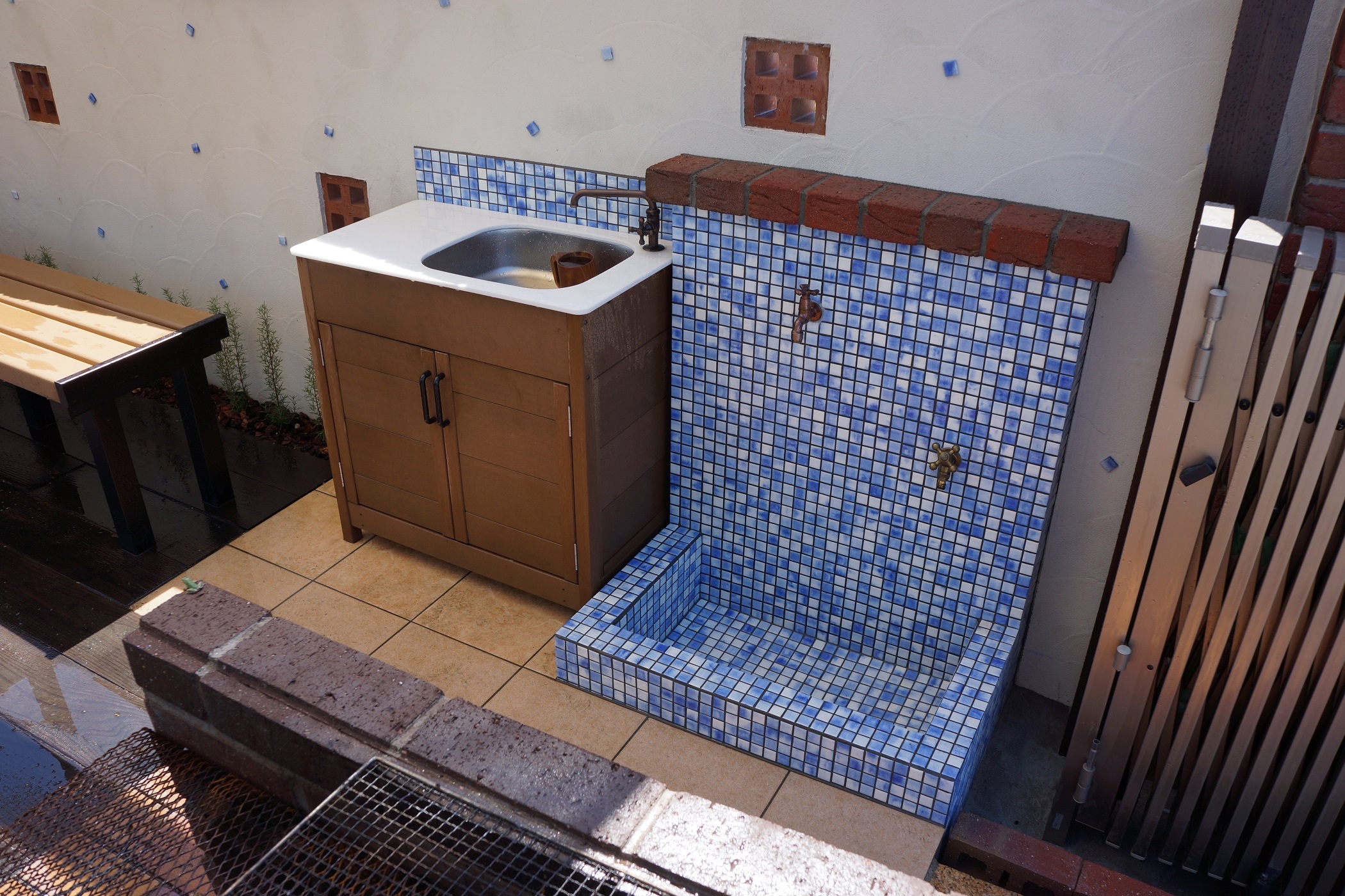 手前側がオリジナルのモザイクタイル貼り立水栓