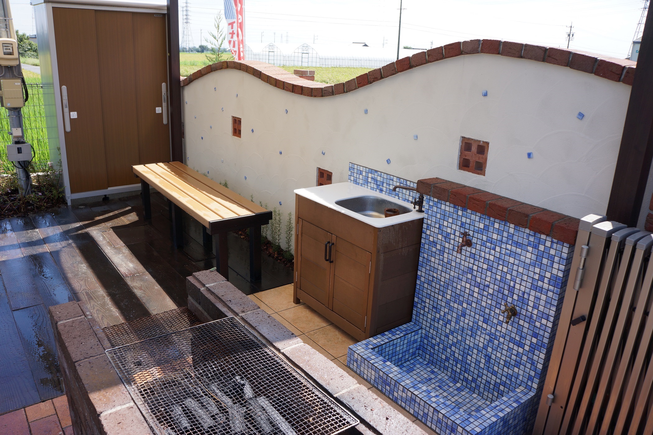 • バーベキュー用のレンガ造りのコンロ、土間も耐熱性のあるレンガ敷きになります。