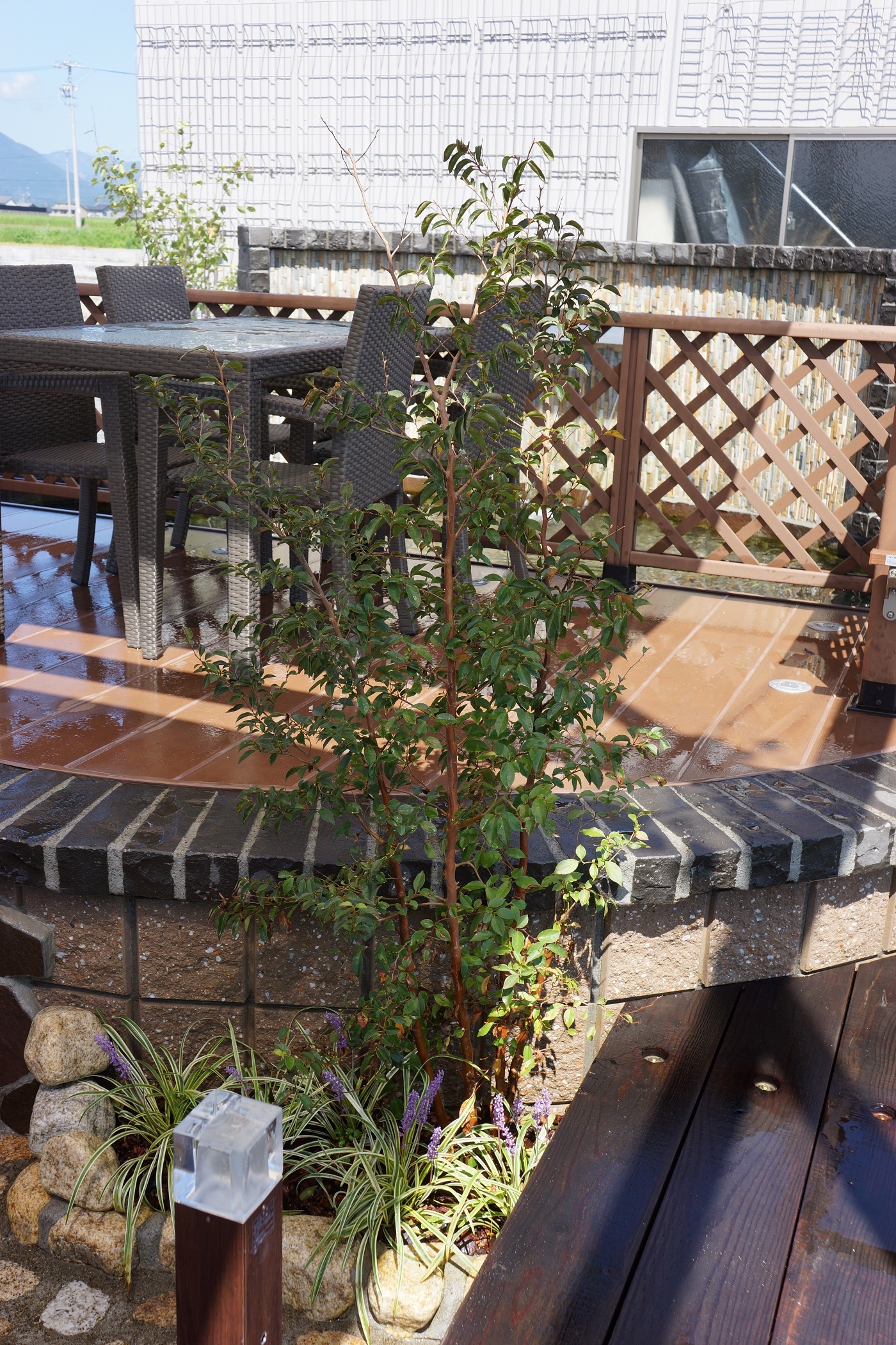 • 奥側のベンチは三協アルミの人工木デッキ材使用の濡縁「ソラノマ フロア」