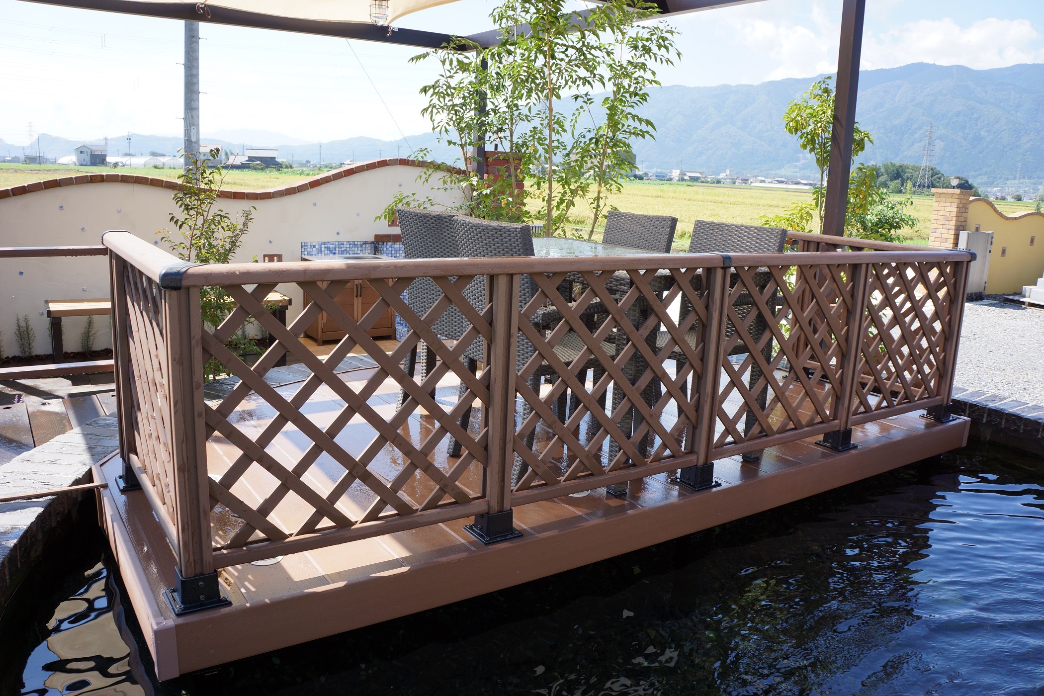 池の上には三協アルミの人工木デッキ「ひとと木2」